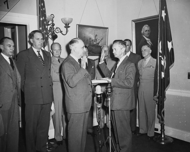 经过近两年的激烈争吵和博弈,美国还是通过相关法案,但在内容上做了一些妥协。1947年杜鲁门签署《国家安全法》,同年“国家军事机构”成立——美国空军独立,保留海军部和陆军部(原战争部),三个军种一起纳入“国家军事机构”指挥之下,首任负责人为福莱斯特。但福莱斯特并没有什么实权,他更像“协调人”而非“指挥官”,各军种部长仍保留内阁席位,有权直接向总统申诉。