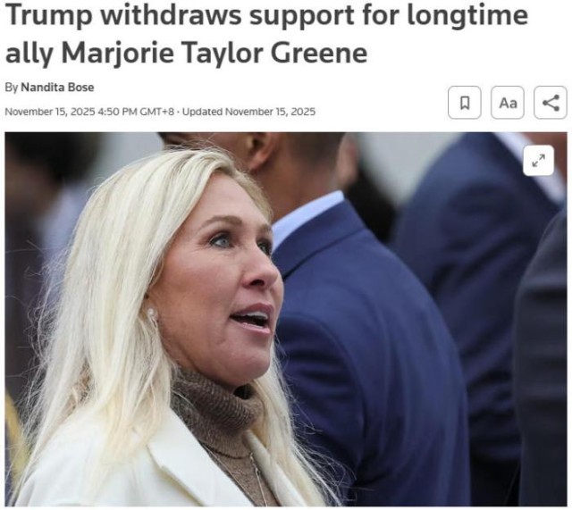 中新网11月17日电 据路透社15日报道,当地时间14日,美国总统特朗普撤回了对共和党籍众议员泰勒·格林的支持,理由是她近期对其议程的批评。报道称,这一举动标志着特朗普与作为他“长期盟友”之一的格林决裂。