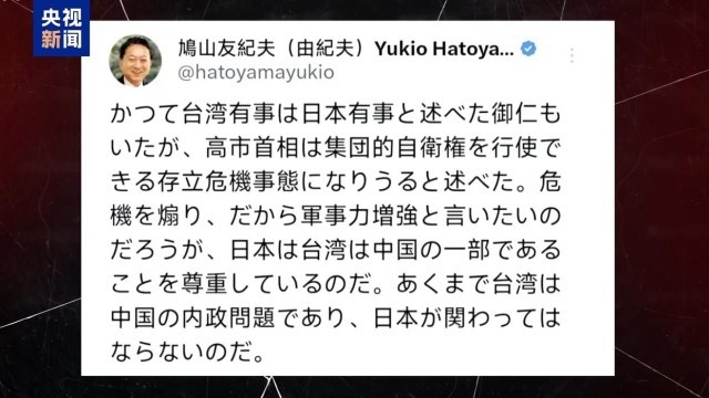 11月8日,日本前首相鸠山由纪夫在社交媒体X上发帖警告说:“台湾问题归根结底是中国的内政,日本不应插手干涉。”