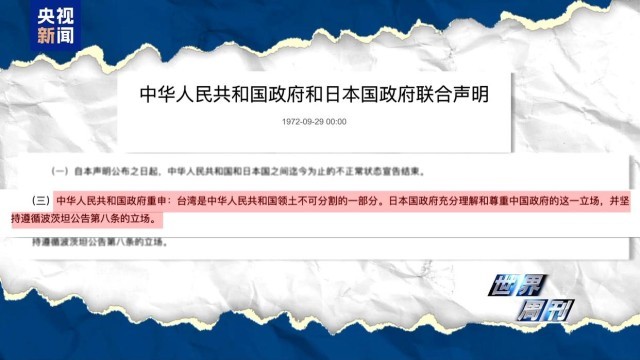 1972年9月29日,中日两国在北京签署《中日联合声明》,声明第三条明确指出:“中华人民共和国政府重申:台湾是中华人民共和国领土不可分割的一部分。日本国政府充分理解和尊重中国政府的这一立场,并坚持遵循波茨坦公告第8条的立场。”