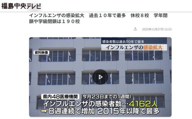 中新网11月27日电 综合日媒27日报道,日本福岛县流感疫情持续蔓延,感染人数达到了过去十年来的最高水平。