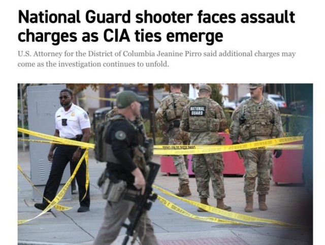 中新网11月28日电 综合美媒报道,美国两名国民警卫队成员26日在白宫附近遭到枪击,嫌疑人随后不久被抓获。最新消息称,嫌疑人是一名29岁的阿富汗男子,曾为美国中央情报局(CIA)工作。