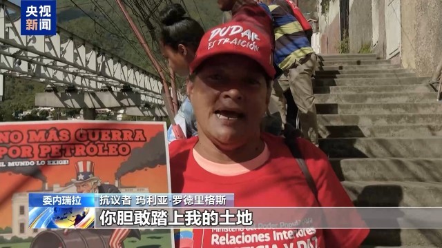 抗议者 玛利亚·罗德里格斯:听着,美国总统特朗普,我只告诉你一句话,你胆敢踏上我的土地,踏上委内瑞拉的土地试试,因为我们在这里,无论男女,无论年龄,从最年轻的到最年长的,我们都在这里,在这片土地上等着,等着看你敢不敢踏上我们的土地。