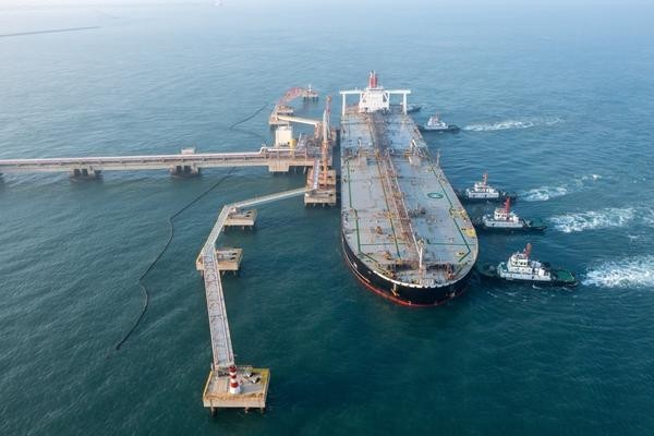12月18日,海南自由贸易港正式启动全岛封关运作,第一批通关“零关税”石化原辅料如期抵达洋浦。这批石化原辅料货值近4亿元人民币,企业可实现零关税进口,可节省成本约千万元。(无人机照片)视觉中国供图