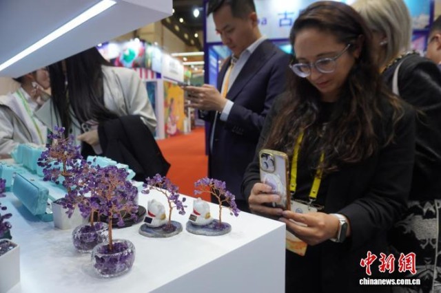 2025年11月3日,第十八届中国—拉美企业家高峰会在河南郑州开幕。图为外宾参观展出的乌拉圭紫水晶产品。中新社记者 韩章云 摄
