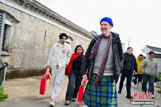 中新网宁波2月1日电 题:苏格兰裙映中国红 国际友人体验宁波年味