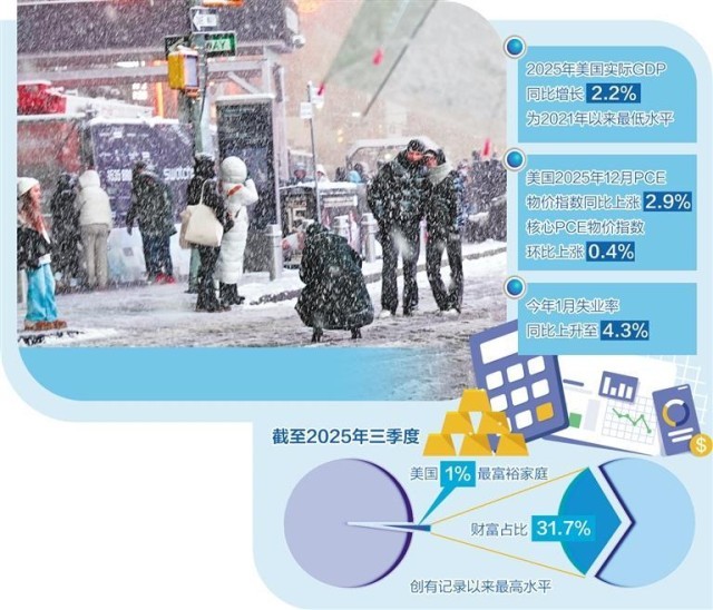 作为经济“压舱石”的消费市场同样疲软,与2025年前三季度相比,四季度的个人消费减弱,商品消费出现负增长,服务消费弱于三季度。劳动力市场也未显强劲,今年1月失业率同比上升至4.3%。美国商务部经济分析局数据显示,通胀黏性仍存,最受美联储关注的个人消费支出价格指数(PCE)超预期上涨。美国2025年12月PCE物价指数同比上涨2.9%,小幅高于11月的2.8%。剔除食品和能源价格后,美国2025年12月核心PCE物价指数环比上涨0.4%,创近一年来最大涨幅。这也导致倍感经济压力的美国民众认为国情咨文演讲不接地气。美联社评论指出,“特朗普的‘繁荣’经济与公众情绪的酸涩相悖”。此外,演讲中称“12个月内吸引超过18万亿美元全球投资”,但有媒体指出,这一数据毫无根据,即便白宫官方统计的9.7万亿美元“重大投资公告”也存在严重水分,多数仅为双边贸易承诺,并非实际对美直接投资。