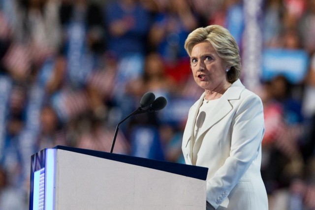 这是希拉里在美国宾夕法尼亚州费城举行的民主党全国代表大会上发表演讲的资料照片(2016年7月28日摄)。新华社记者李木子摄