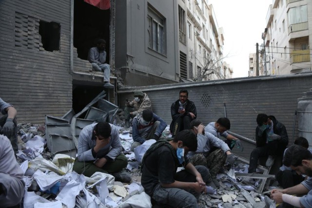 3月15日,在伊朗首都德黑兰的一处遇袭居民区,人们坐在一处建筑废墟上。