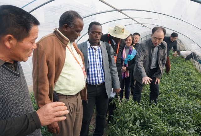 在中国江西省鄱阳湖湖区,来自非洲维多利亚湖区的学员在一处蔬菜大棚种植基地考察(2014年摄)。