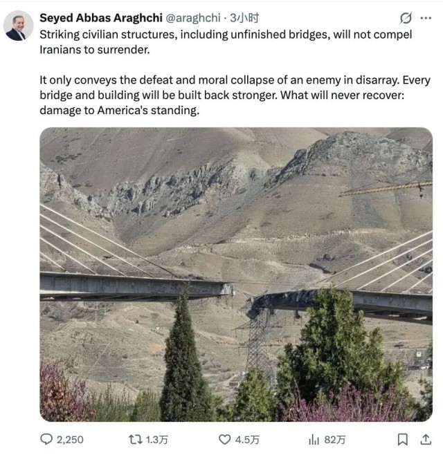 阿拉格齐在社媒发文回应说,破坏民用设施,包括未完工的桥梁,并不能迫使伊朗投降。