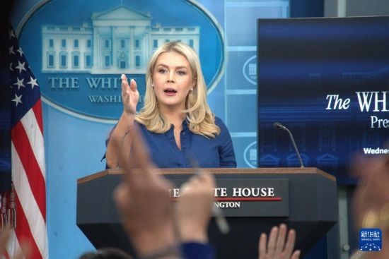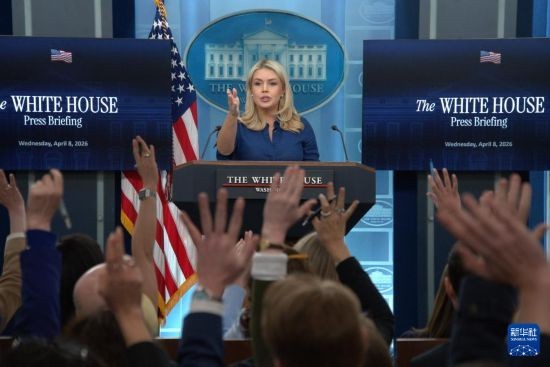 4月8日,在美国首都华盛顿白宫,白宫新闻秘书莱维特出席记者会。新华社发(李源清摄)