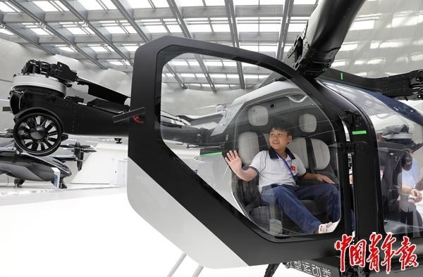 4月13日,广东省广州市小鹏科技园,来自越南的一位少先队员,正在体验乘坐一架飞行汽车。中青报·中青网记者 陈剑/摄