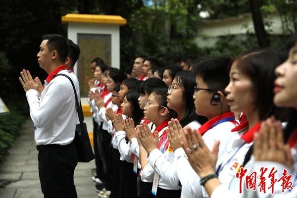 4月12日,广东广州黄花岗公园,越南青年来华“红色研学之旅”之“不忘初心”研学营少先队分团的团员们,瞻仰越南志士范鸿泰烈士墓并举行祭奠仪式。中青报·中青网记者 陈剑/摄
