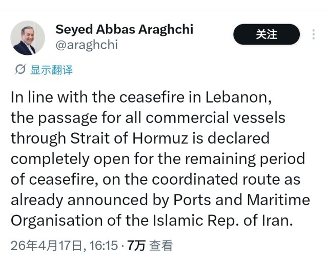 当地时间17日下午,伊朗外长阿拉格齐在社交媒体发文称,鉴于黎巴嫩和以色列达成停火,在停火期间,伊朗对所有商船开放霍尔木兹海峡。
