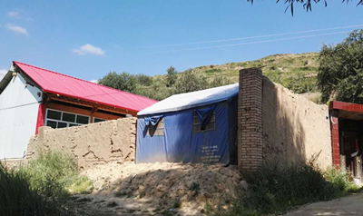 至今石家院墙边还立着一顶写有“民政救灾”字样的蓝色帐篷。2013年7月定西地震后一直到来年的4月份,石家都生活在这个帐篷里。