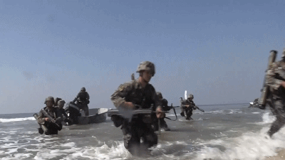 东南某海域,第31集团军某部开展的多兵种合成登陆演练正紧张进行。武装直升机凌空突击,两栖装甲正面抢滩夺要,特战分队敌后破袭策应,空地一体展开立体打击,完成作战任务。