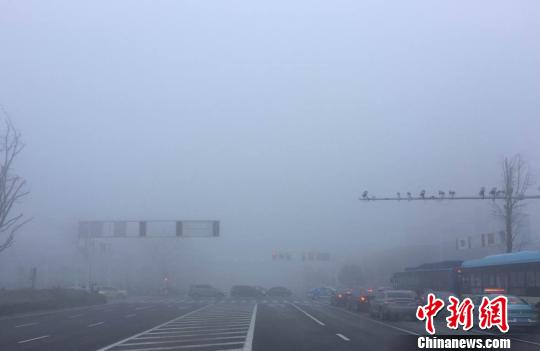 图为1日,扬州遭强浓雾,红绿灯“隐身”大雾中。 崔佳明 摄