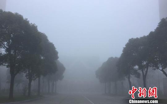 图为1日,扬州遭强浓雾,几十米外的建筑被隐身。 崔佳明 摄