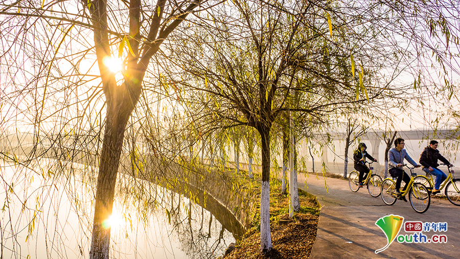 华东交大学子骑着单车路过孔目湖畔,在2017年的第一缕阳光下享受着华东交大的惬意与美好。一山一湖一小道,一人一车一群友。趁阳光正好,微风不燥,相约湖边,骑车畅聊。中国青年网 梁健萌 摄
