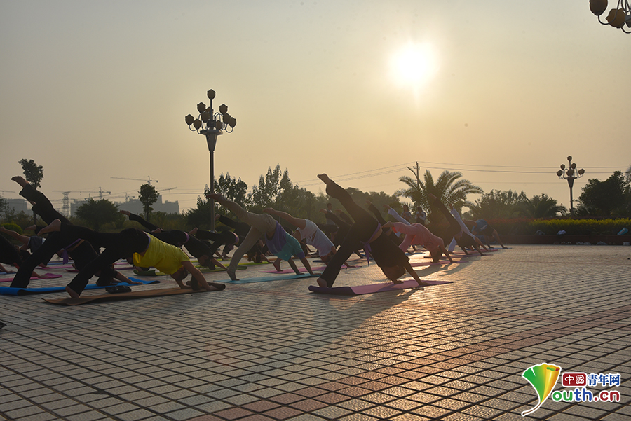 2017年第一天清晨,赣南医学院的同学早早地来到黄金校区综合大楼前,铺好了瑜伽垫,用瑜伽的方式迎接新年清晨的第一缕阳光。中国青年网 钟世华 摄
