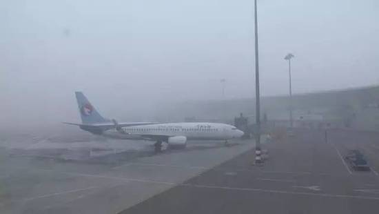 △今天,石家庄国际机场,大雾致使105架次航班取消或延误