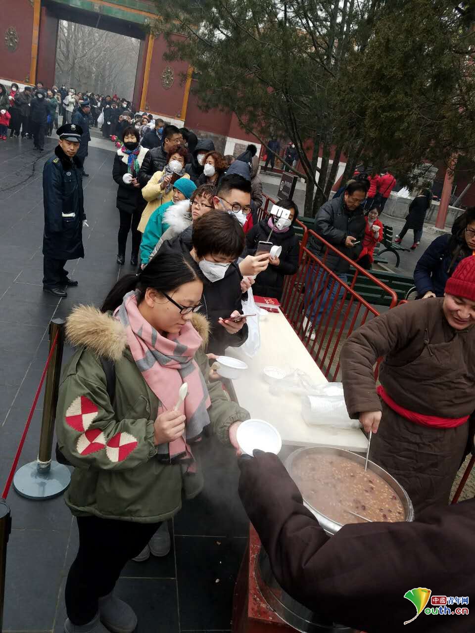 北京雍和宫数千民众排百米长队喝腊八粥祈福。中国青年网记者 张瑞宇 摄