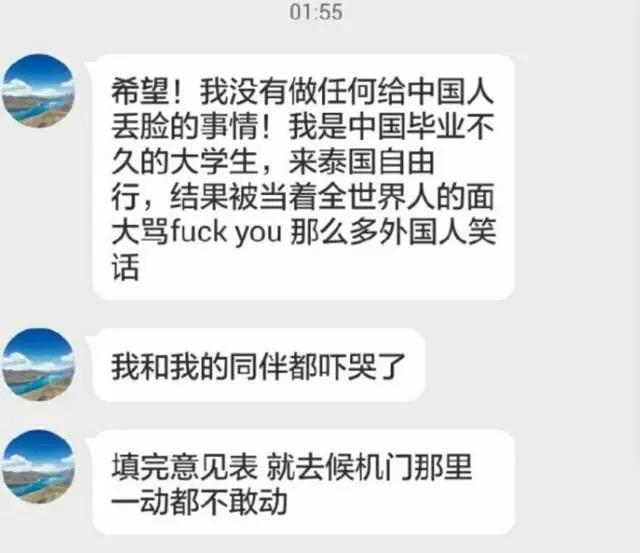 当事中国游客接受媒体采访时讲述了事情经过:“2017年1月5日晚19时,我与同伴搭乘CZ8324航班由曼谷素万那普国际机场飞回深圳,换了机票安检完,进入海关护照查验区域排队,发现我们的离境卡被放入旅行箱托运了,于是我向站在旁边的一位女性工作人员询问哪里拿卡,我很谦虚有礼貌地询问,对方并不理睬,我又问了一遍,她十分不耐烦,她不会说中文也不会说英文,用泰语和我对话,我怎么听得懂?我比划到最后她用力往我手上拍了一张离境卡,我用英文说我们两个人,还需要一张,她问我是哪里人,我说中国人,她更加用力往我手上拍了一张卡,说了一句f**k you。我蒙了转身就走,她一直追着我骂。那么多排队的人, 哄堂大笑。笑我这个中国人吗?!不!他们是在笑这位泰国最大机场的工作人员追着客户骂!我必须要求道歉以及解决方法!”