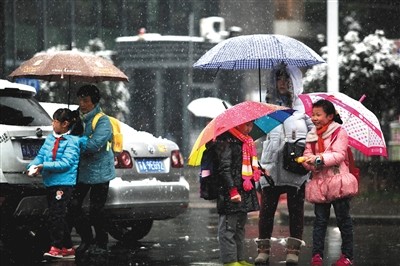 2016年11月23日下午,众多学生家长在南京市金陵汇文学校门口,顶着雪花接孩子放学。当日,南京第一场雪如约而至,为了确保孩子在雪天里的安全,家长们纷纷前往学校,守护孩子过街和陪护回家。 图/视觉中国
