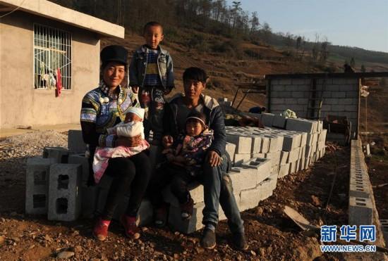 吉仕日出和妻子格吉莫沙子同孩子们在新房前合影(2月12日摄)。新华社记者陈燮摄