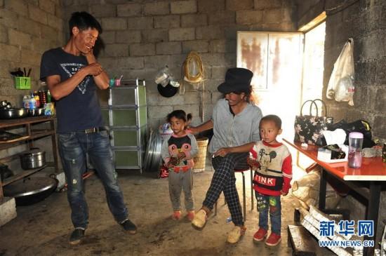 吉仕日出和妻子格吉莫沙子同双胞胎子女在当年的老房子中(2016年10月摄)。新华社记者陈燮摄