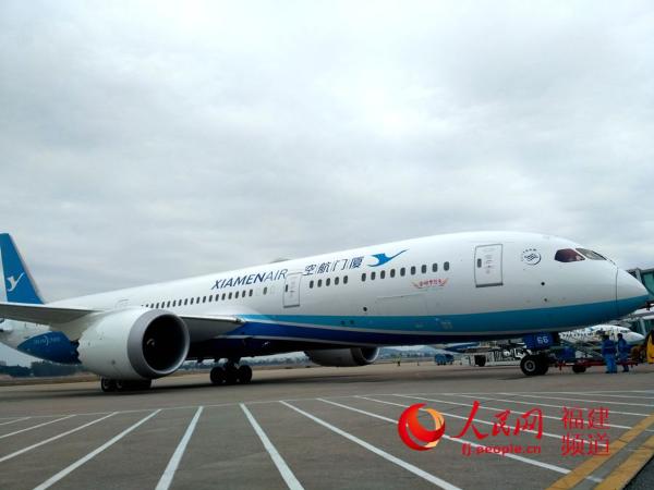 这是福建省首条直飞美国的洲际航线,由厦门航空开通。据介绍,福州至纽约航线全部使用波音787-9飞机,每周一、三、六执飞,飞行距离达到14000公里,全程飞行时间约14.5小时,往返一趟相当于绕地球一圈,是787飞机执飞的世界第三长航线。