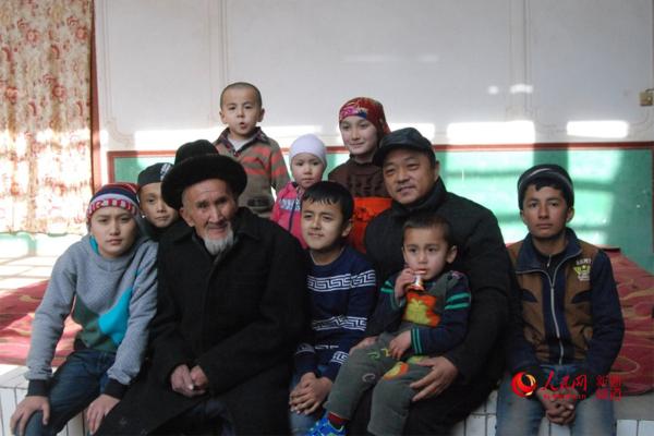 今年90岁的吐尔逊·艾力木(前排左二)带着儿孙们在自家大院里与新疆维吾尔自治区工商局驻阿图什市库兰其村工作队副队长钱峰(右二)一起合影留念。孩子们的欢笑声,打闹声使得这个五世同堂的大家庭显得十分热闹。记者胡仁巴 摄