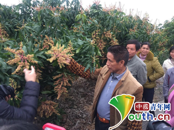 全国扶贫状元、原尚兴村党支部书记莫文珍向记者介绍芒果树的种植经验。(武亚姮 摄)