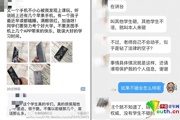 中国青年网北京2月28日电 (实习记者 崔楠 记者 李永鹏) 近日,有网友发微博反映德阳一中学老师发现学生上课玩手机后要求学生自行将手机砸坏,事后发朋友圈赞赏该同学“真的爷们。很佩服他”。中国青年网记者致电四川省德阳中学政教处,值班老师告诉记者,将手机砸毁的处理方式肯定欠妥,如查明情况属实校方将在了解相关情况后进行处理。