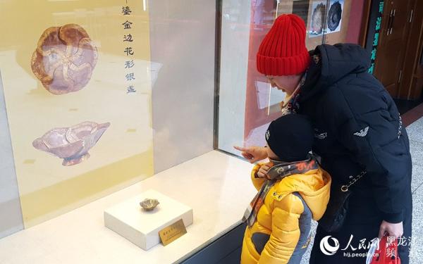 游客在黑龙江省博物馆观看鎏金边花形银盏展品。焦洋 摄