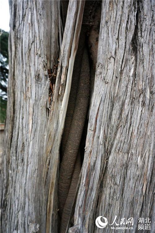 当地村民介绍,该柏树树心是有空洞的,一些大鸟经常刁树种在树上吃,黄连树种子落进柏树洞里经树洞里的雨水生根发芽长出黄连树,形成现在双树生长奇观,该树于2012年12月已被丹江口市挂牌保护。(周家山)