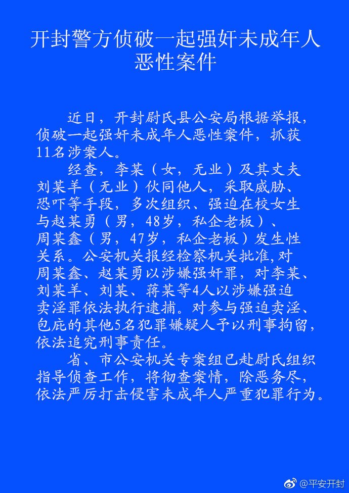 近日,开封尉氏县公安局根据举报,侦破一起强奸未成年人恶性案件,抓获11名涉案人。