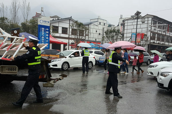 昨天陕西丹凤降下小雨,交警在雨中疏导交通。(图片来源:@丹凤交警Stone)
