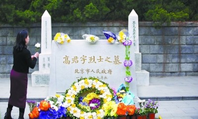 昨天,在高君宇烈士墓前,“五龙亭朗诵艺术团”的团员为烈士敬献鲜花并扫墓。 本报记者 方非摄