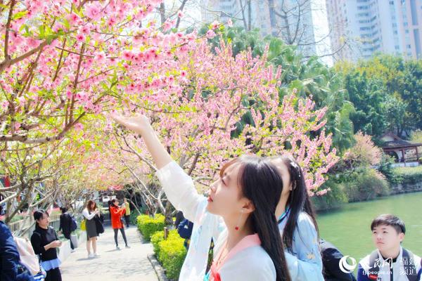 人民网福州4月13日电(余杉芳)4月的春光明媚,和风暖人。几位身着汉服的动漫系女大学生漫步福州西湖公园,引来不少游客的围观。