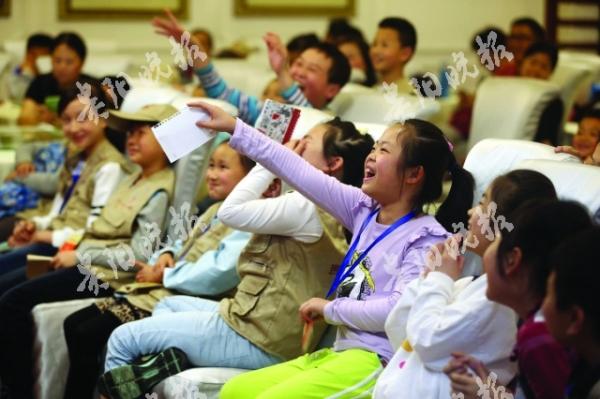 在欣赏完相声表演后,主持人通过“站”和“坐”的反向口令,在全场的小记者中选拔出10名登上舞台,练习绕口令。“八百标兵奔北坡,北坡炮兵并排跑,炮兵怕把标兵碰,标兵怕碰炮兵炮。”张子俊流利的念出纸条上的口令,获得刘老师的赞许。