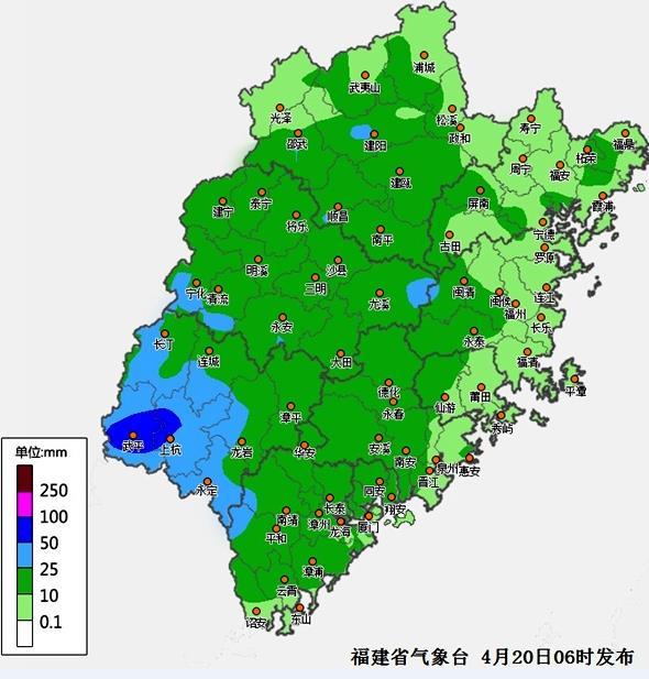 据气象部门预报,20日,福建全省有中到大雨,龙岩的局部有暴雨。福建省气象台还于7时5分继续发布雷电黄色预警信号,预计未来6小时南平、漳州、厦门三市和泉州南部、三明北部的局部县市有雷电活动,并伴有短时强降水、6-8级雷雨大风等强对流天气。