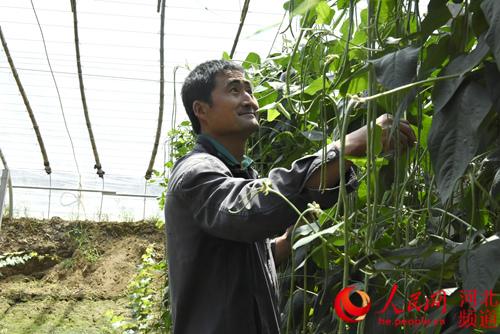 图为饶阳县村民观察自家大棚里种植的豆角长势。王雅洁 摄