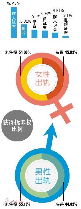 出轨与获得抚养权是否有关系?数据显示,男性被认定为出轨的离婚案中,有44.82%的男性获得了子女的抚养权。在女性被认定为出轨的离婚案中,有45.92%获得了抚养权。由此可见,夫妻一方出轨与否与获得子女抚养权没有必然联系。(魏丽娜)