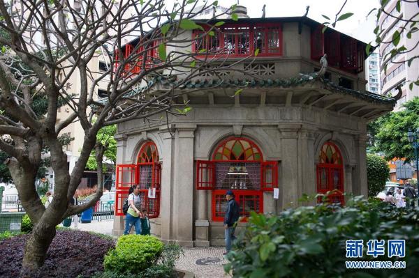 4月22日,行人从澳门八角亭图书馆外走过。中西合璧的八角亭图书馆原为澳门中华总商会附设的书报室,它隐于闹市街角,堪称澳门最“迷你”图书馆。八角亭图书馆藏书2万册,收藏报刊90多种。新华社记者 张金加 摄