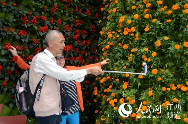 两位老人用自拍杆在花墙旁自拍。