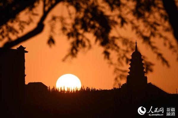 5月5日,一轮红日从新疆库尔勒市郊区升起。