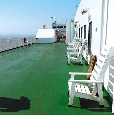 登上轮船的最高层,记者随“中远之星”客运部主任赵朋走出舱门,来到甲板上。对于一年有十个月随船航行的他来说,船上的生活他已是熟悉得不能再熟悉了:“旅客们刚上船时,大家放好行李后都喜欢登上甲板远眺,毕竟夕阳西下,海面上呈现金光点点的余晖还是很美的;而晚饭后因为海面上寂静且漆黑,天空中的星星一闪一闪,显得很明亮,有时候在对应的季节,还能遇上萤火虫;而第二天一早,迎接旭日朝阳也是游客们喜爱的乘船项目之一。哦对了,公海上偶尔还会遇到海豚……”听着赵朋的描述,记者对船上的美景充满着向往。不过,这艘船的功能并不局限于客运,还有货运与车辆摆渡的作用。