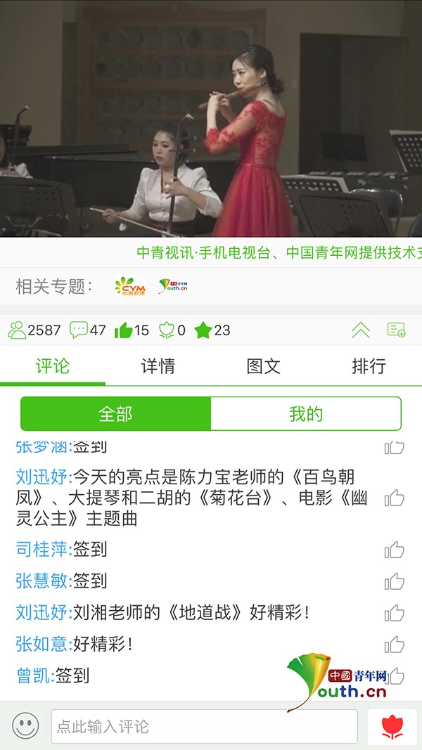 图为“青年之声·直播厅”《器乐中国》栏目直播页面截图。